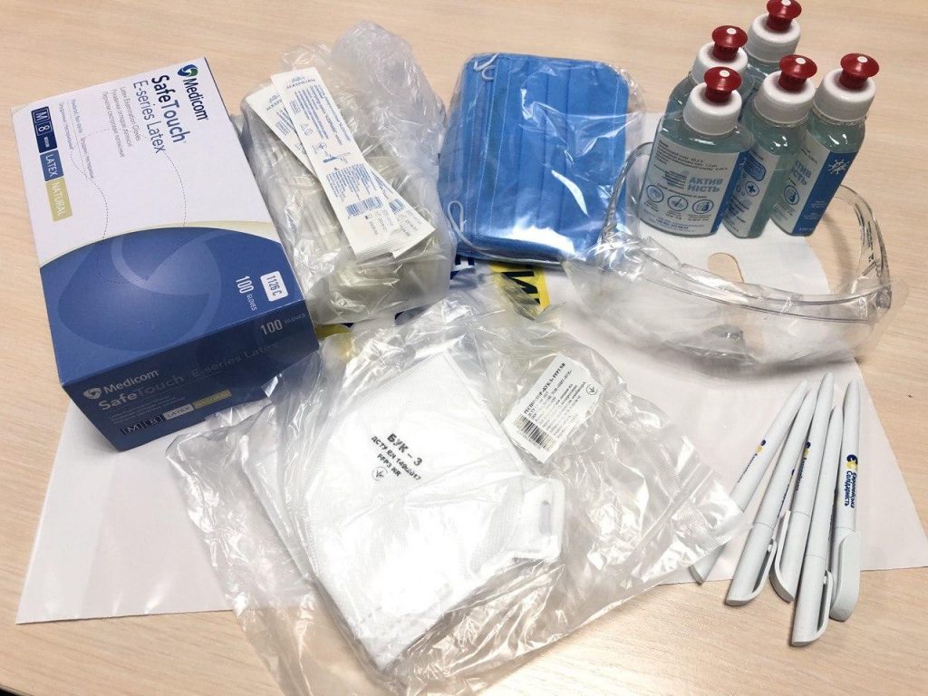 Кожен пакунок містить десять одноразових захисних масок, три респіратори FFP3, п’ятдесят пар медичних рукавичок, п’ять флаконів антисептику, п’ятдесят медичних шпателів, захисний екран або окуляри.